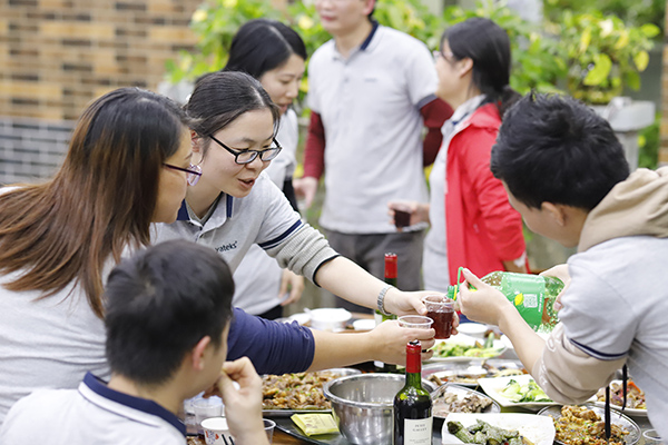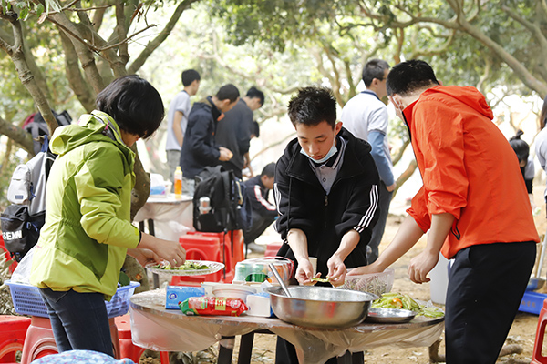 中午時分,年會開始了吃貨環節,大家自己動手、豐衣足食,各團隊將自帶的食材及酒水、飲料等歸集一起準備各自小組的午餐,各組隊成員有的切菜、有的洗菜,有的拾材,有的炒菜,一盤盤香噴噴、美味可口的家常菜西紅柿炒蛋、虎皮尖椒、年年有魚、肉沫茄子等美味可口的菜肴很快就做好并迅速被一掃而光,其樂融融,吃得好、喝得好,玩得好,好不熱鬧。