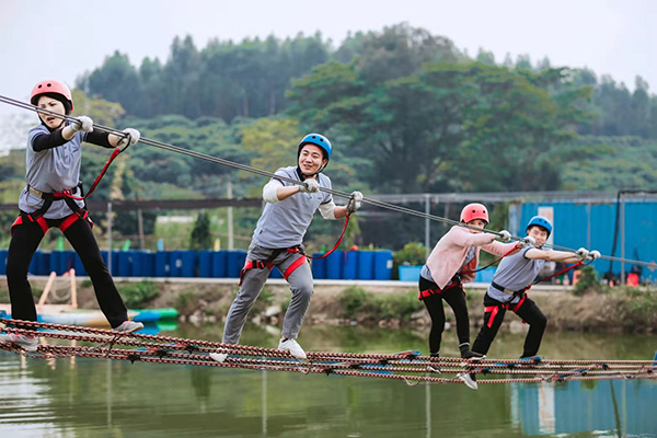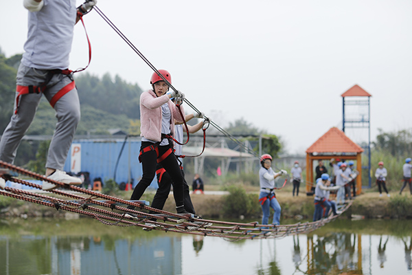 野炊結束午間休息后,年會進入到下半場,下午兩點開始,所有隊員在教練的指導下抖擻精神、重新整裝再出發,開始叢林穿越、高空溜索、飛奪瀘定橋等項目,隨著高空溜索、飛奪瀘定橋等項目的展開,各個小組發揮各自的優勢努力完成每一個項目,每個項目的進行和完成極大的鍛煉了團隊成員的堅強意志、增強了大家的團隊凝聚力和整體向心力,同時每一個人也感受到了團隊合作與溝通的重要性。